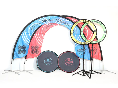 This is the official Aerial Drone Competition field basics kit. It includes a collection of arches, keyhole gates, landing pads, cubes, and a blackout curtain, reusable every year in the Aerial Drone Competition. Our CoDrone EDU can be used to participate in the competition—it's one of the only drones approved for the competition.
