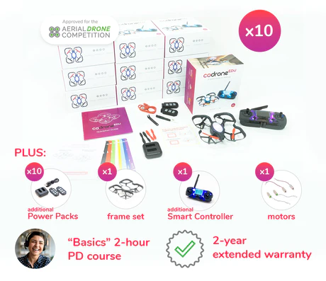 This is a great bundle for a small classroom. It includes 10 drones with additional accessories and professional development to make sure you're confident using it in the classroom on day one. We recommend two students to one drone, with a drone or two for the teacher. This is a great set to purchase for a class of 5-15 students.