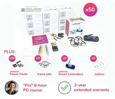 This is our ultimate bundle for a school. It includes 50 drones with additional accessories, game elements for the Aerial Drone Competition, and professional development to make sure you're confident using the kits in the classroom on day one. We recommend two students to one drone, with a drone or two set aside for the teacher. This is a great set to purchase for a class of 50 - 90 students.