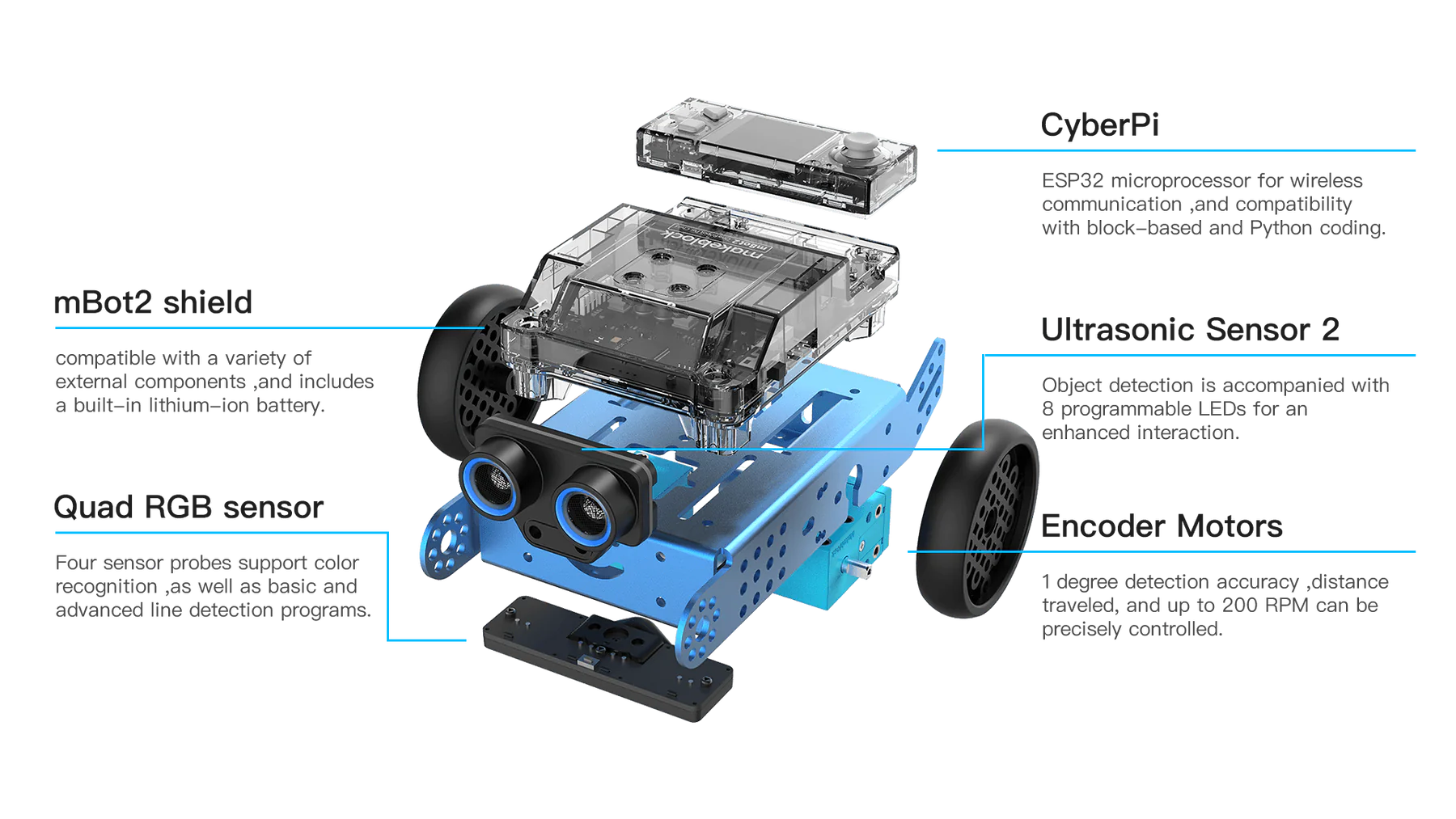 With enhanced features and capabilities, the mBot2 offers an immersive hands-on learning experience. Equipped with a durable aluminum chassis, powerful motors, and a wide array of sensors, including ultrasonic, line-following, and light sensors, it is ready to tackle any challenge.