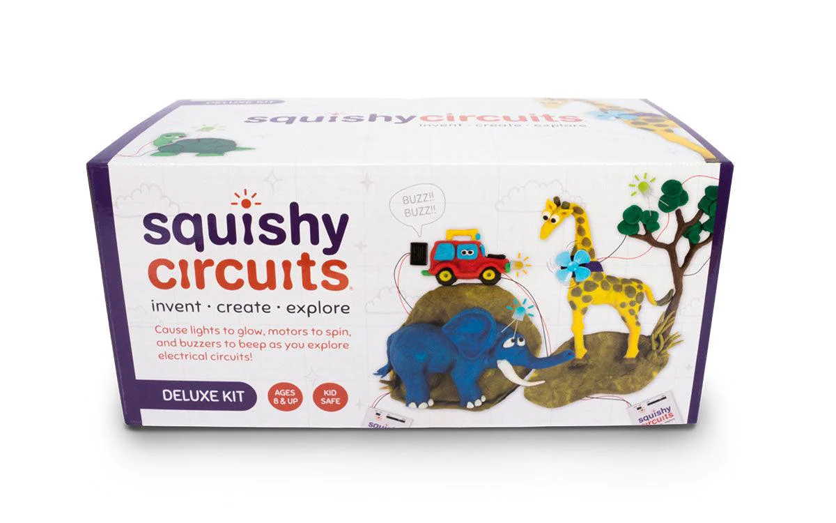 Start circuit building right away with the deluxe kit, our most complete Squishy Circuits kit. With more items than the standard kit and with pre-made doughs, you can start creating and playing without all the unnecessary waiting! This kit also includes a deluxe battery holder which has a knob that allows your lights to blink and buzzers to beep at different speeds.