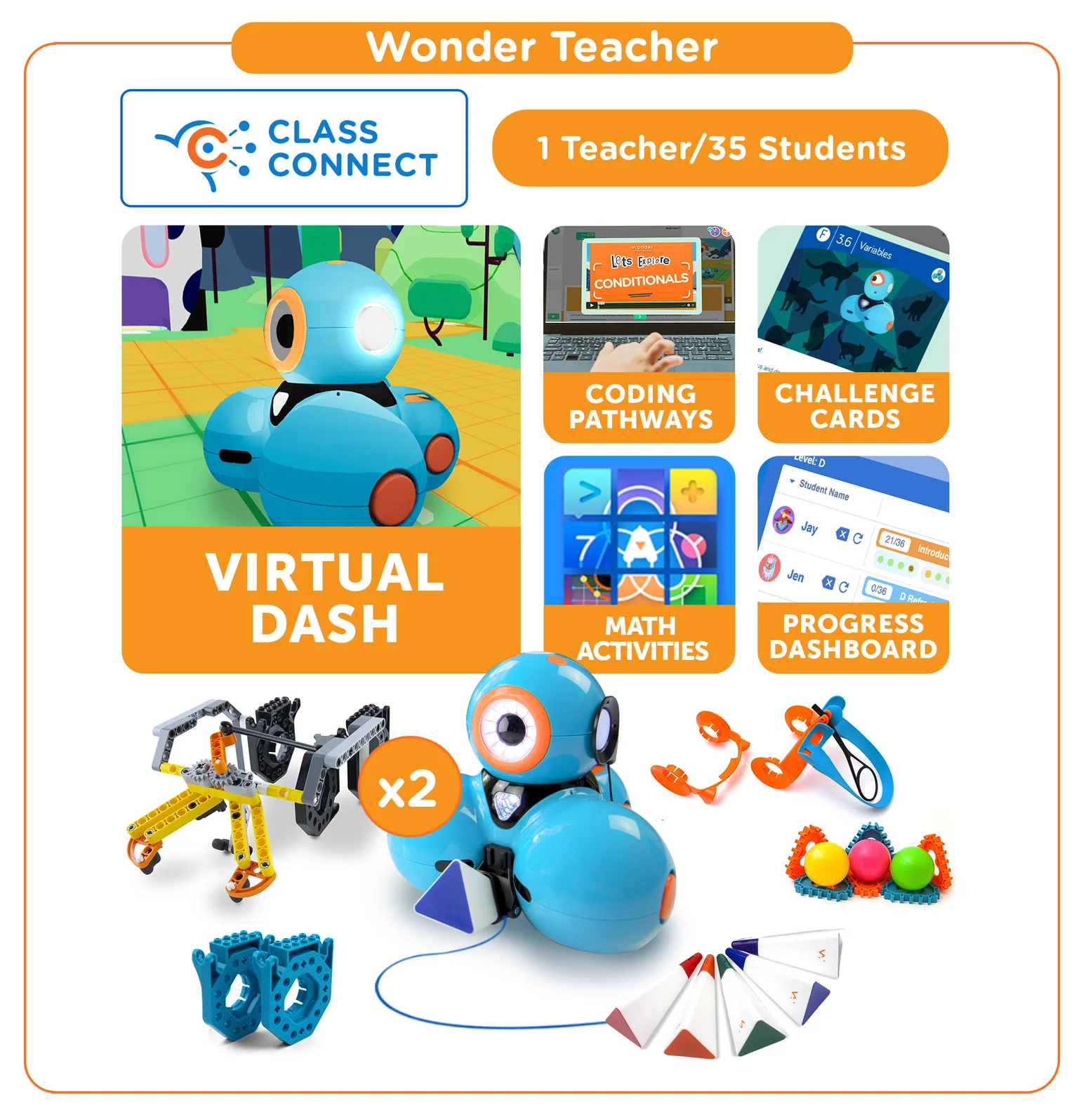 Also included is a 1-Teacher/35-student license to Class Connect, which provides access to a Virtual Dash robot that is programmable onscreen, accounts in the programming app, in-app coding lessons called Coding Pathways, and tons of assignable and trackable activities.